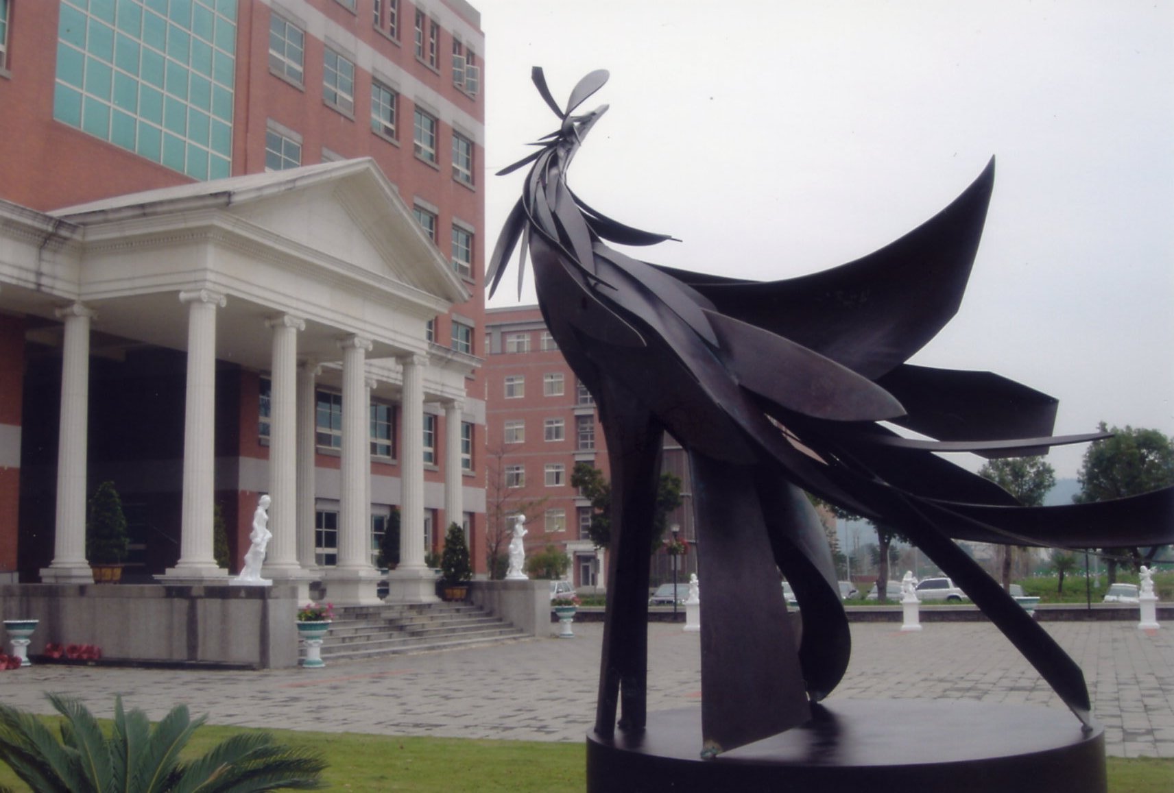 亞洲大學園區內之景觀雕塑案例;以主軸動線與建築語彙為尺度依據,形成穩定的公共節點。