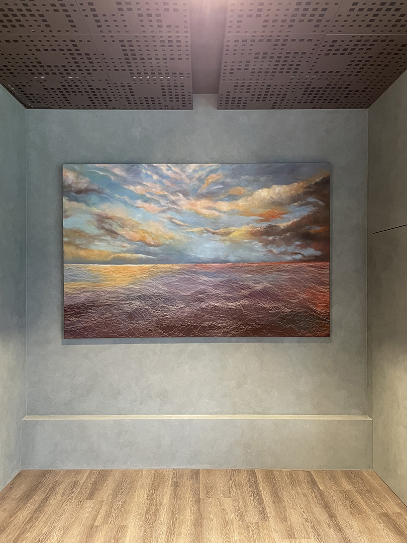 Installed on the principal wall of a corporate lobby, the painting employs a restrained yet dynamic abstract language that resonates with stone, metal, and architectural lighting. As a long-term collection, the work establishes a composed visual anchor within daily circulation.