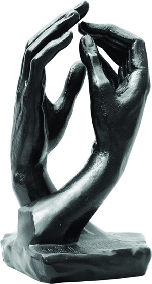 這是羅丹最後作品之一。創作於1910年,兩手向天舉起如祈禱似的。奇怪是,這是兩隻右手緊扣在一起,如同哥德式建築(gothic arch)。因此,以《大教堂》為作品名稱。 羅丹在1910年雕刻這件石頭作品和喬治盧德(Georges Rudier)為羅丹美術館鑄造12件銅雕。 此件作品的形狀和姿態猶如中世紀大教堂,正表達了羅丹當時對哥德式建築的激情。1875年冬天,羅丹在去義大利的旅途中開始對法國大教堂產生一股激情。當他從生活和工作的布魯塞爾乘火車途中的第一站即法國東北角的蘭絲城(Reim)。當時羅丹即被堪稱法國最具盛名的蘭絲城哥德式大教堂所震撼,這個印象一直停留在羅丹的腦中,並在1914年出版了《法國大教堂》一書。 二隻手象徵一對戀人,緊密垂直的連結在一起,形成大教堂曲拱的形狀,如禱告似的。1910年羅丹雕刻了這件具有和平友好之意的石雕作品,有別於羅丹其他創作,這件作品並沒有明確的表現性愛,但卻暗喻了神聖的物理結合。 這件銅雕作品,是以羅丹創作的石膏作品為原模,於1998年再翻鑄限量雕塑。每一件作品都屬名《RODIN》。 尺寸:65 x30 x 30 cm 構思年代:1908 翻置25件銅雕:編號 1/25 至 25/25 鑄造章:Airaindor. 技法:脫蠟鑄造 RODIN IN TAICHUNG 羅丹雕塑展 地獄門VS.愛 2007.9.22-12.22 臺中市役所