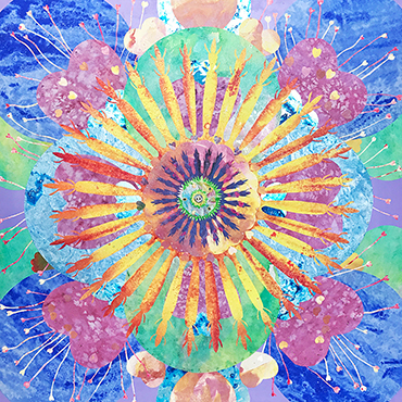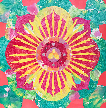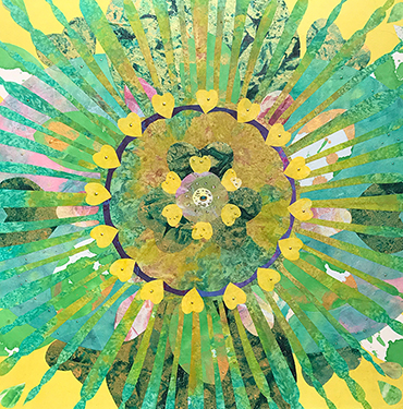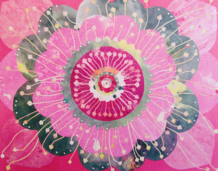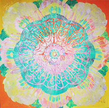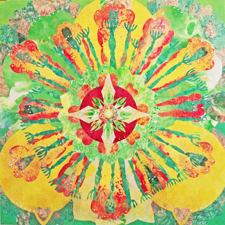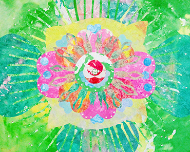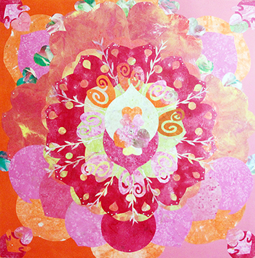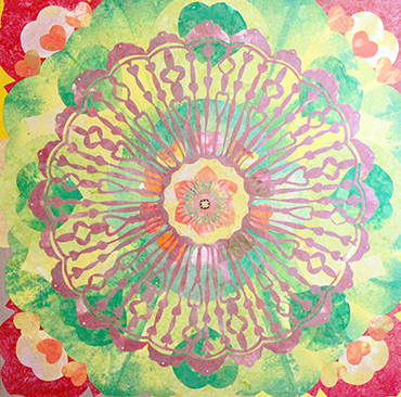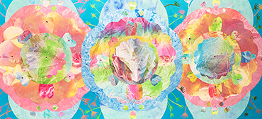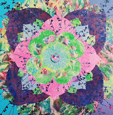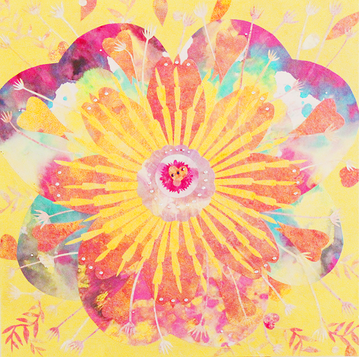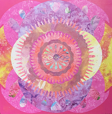 辜琪鈞2018年發表的「花語」系列,以各種花型做代表創作出抽象萬花筒式的圖形,宛如圓舞曲的節拍,舞步由中間慢慢展開來,儘管是平面的圖像也能有音樂感。作品使用膠彩打底,將各種金/銀/銅箔以及水晶在畫面上點綴,在燈光下,畫作的每個角度都會反射出不同的效果,細節就像少女的心豐富且細膩,讓觀者也能一起進入藝術家創造出來的異想世界。
