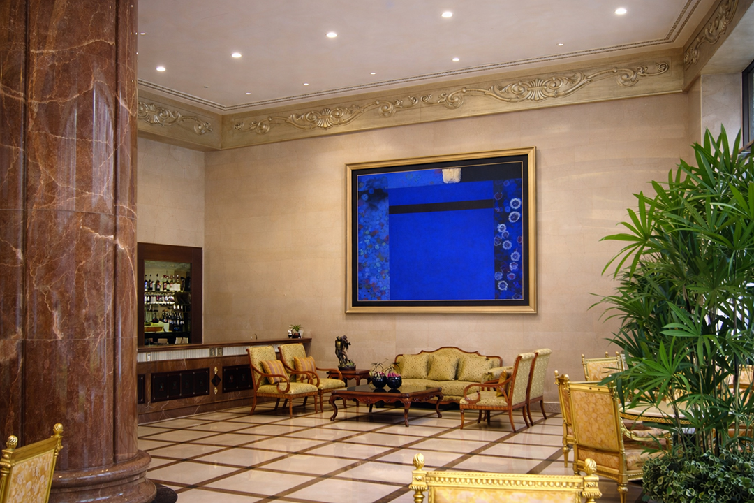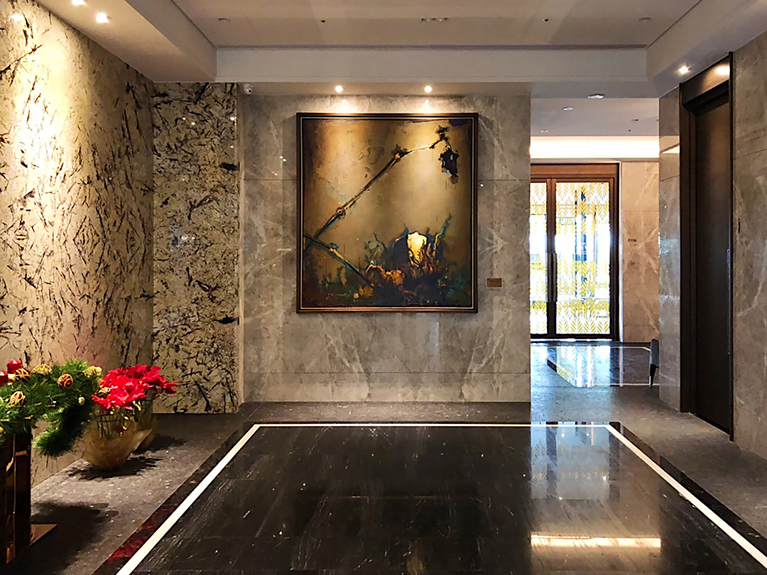 作品設置於建築公共大廳核心牆面,透過沉穩而具張力的抽象語彙, 與石材、金屬與光源形成整體空間節奏。 作為長期收藏與展示,作品在日常動線中建立靜定而內斂的視覺重心。