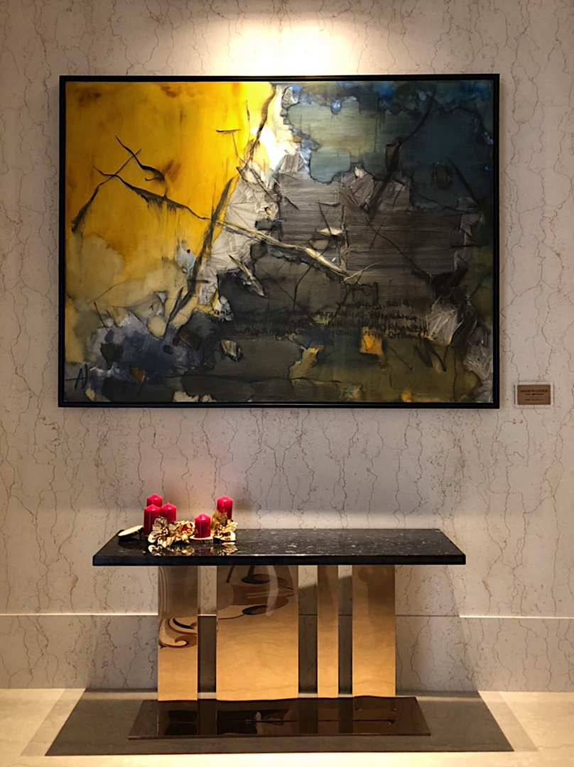 Installed on the principal wall of a corporate lobby, the painting employs a restrained yet dynamic abstract language that resonates with stone, metal, and architectural lighting. As a long-term collection, the work establishes a composed visual anchor within daily circulation.