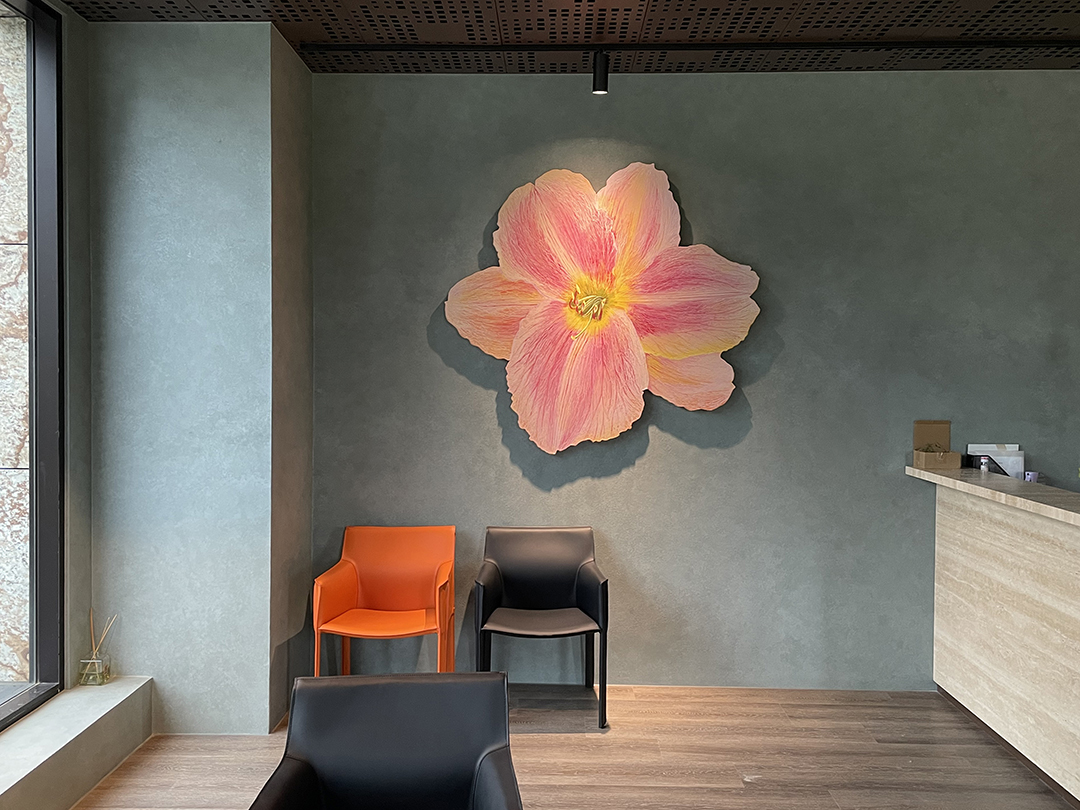 作品設置於大型公共空間主牆,回應挑高尺度與對稱軸線, 以姜淼一貫的層疊結構與流動色域,為理性而秩序分明的建築空間 引入柔性節奏與可長時間觀看的視覺深度。 作為公共景觀的一部分,作品不以事件性呈現, 而是在日常運作中形成穩定而持續的感知背景。