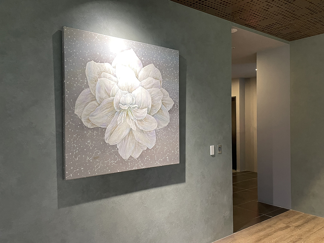 作品配置於大廳迎賓主牆,以橫幅構圖呼應空間的水平延展與禮賓動線。 柔化的光感、灰階層次與低飽和色調,與浮雕牆面、弧形拱頂與石材肌理形成互補, 使作品在高尺度公共空間中維持安定的視覺重心與細緻的觀看距離。