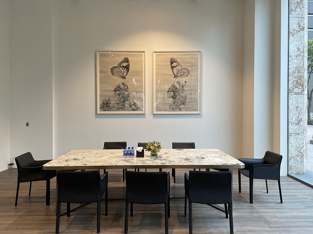 Installed on the principal wall of a luxury residential meeting room, the diptych responds to the space’s symmetry and the scale of the conference table. Through a restrained and finely articulated visual language, the works sustain a composed atmosphere—remaining unobtrusive during discussion while offering quiet depth in moments of pause.