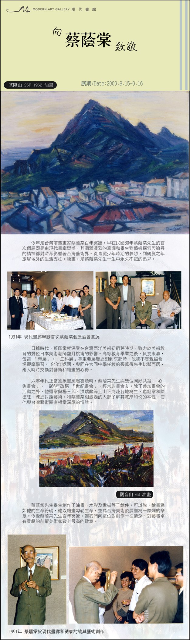 今年是台灣前輩畫家蔡蔭棠百年冥誕,早在民國80年蔡蔭棠先生的首次個展即是由現代畫廊舉辦,其瀟灑濃烈的筆調和畢生對藝術探索與追尋的精神都對深深影響著台灣藝術界。從青澀少年時期的夢想,到鶴髮之年旅居域外的生活支柱,繪畫,是蔡蔭棠先生一生中永矢不滅的追求。