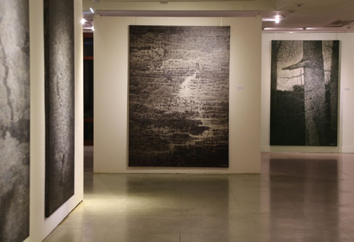 減去色彩是追憶的第一步驟,保持著東方固有的墨韻是原則。誠如荊浩將「似」與「真」對立起來,指出「似者得其形遺其氣,真者氣質俱盛。」直達到超乎向外氣度的可能性為止。因此,在肌理的刻畫上加了如雕刻般的痕跡,老實的將所要的質感,反覆的刻畫出來,之後再將作品層層渲染。