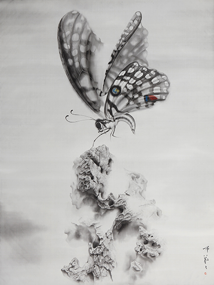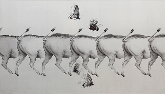 源自不同語境的母題如此突兀地並置於畫面之上,從而消解了「古典」的優雅特質,不僅凸顯出作品無可置疑的現代性,而且賦予了這些用水墨繪於絲絹上的繪畫以某種超現實主義(Surrealism)的「荒誕」意味。