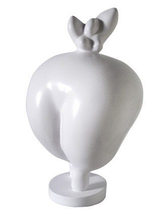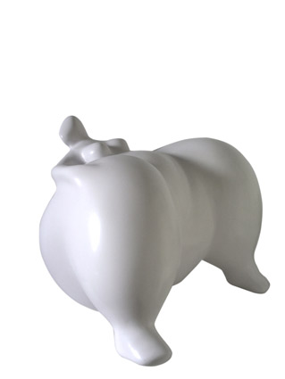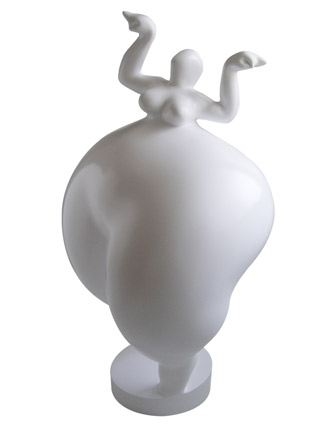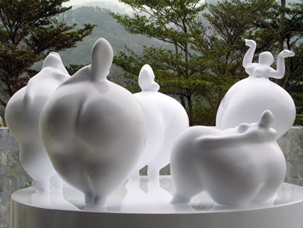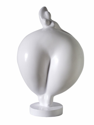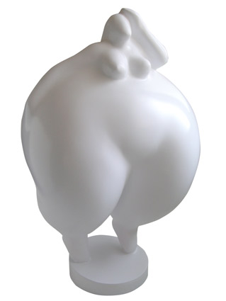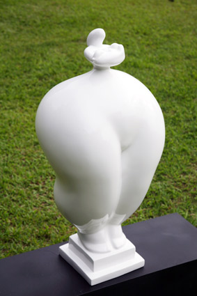 對於女性豐腴下半身的創作始於2007年《無時無刻》的展覽,發表的小品將女體結合於宗祠古厝的造形之上,宗祠古厝即成為作品的基座。今年的展覽更進ㄧ步將傳統雕塑的基座去除,作品《白色雕塑》一如多胞胎,分別倒吊於空中,直接站立、側躺、俯臥於地面等多種姿態展現,以「非定點雕塑」在空間中的靈活形式,讓作品從四面八方三百六十度觀視,出自同ㄧ個造形衍生出多變的視覺感受,與空間生成各異的對話氛圍,大尺寸的作品更適合與景觀結合,不管是現代感的建築或是自然環境,《白色雕塑》如單一細胞卻不斷衍生出意象,激活了空間中的生命動力。