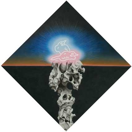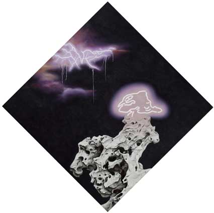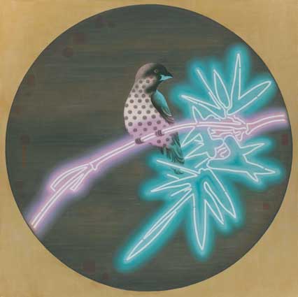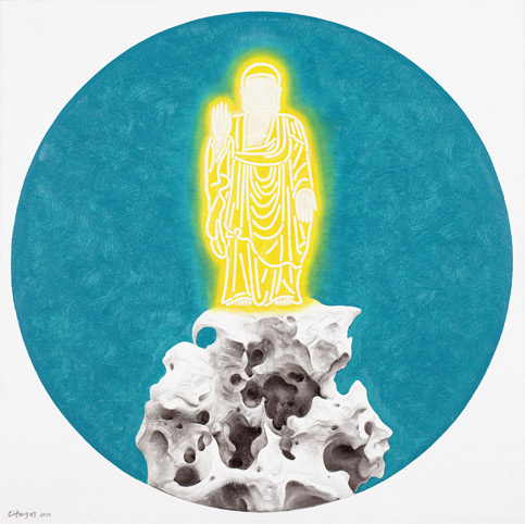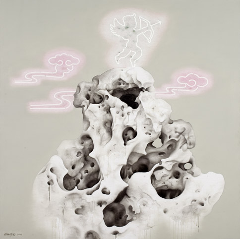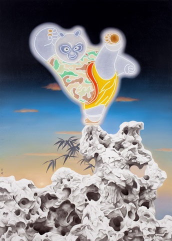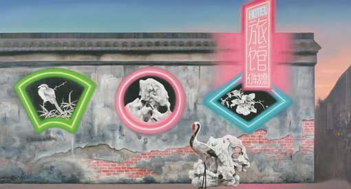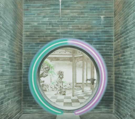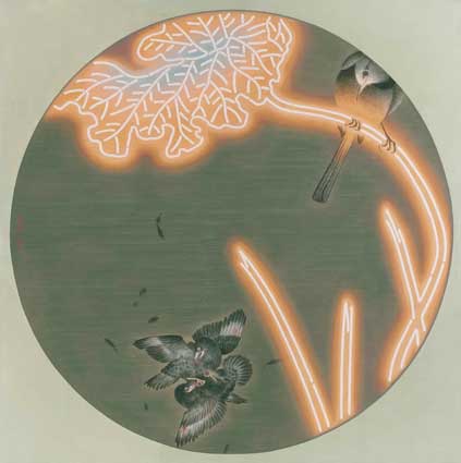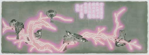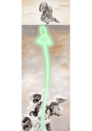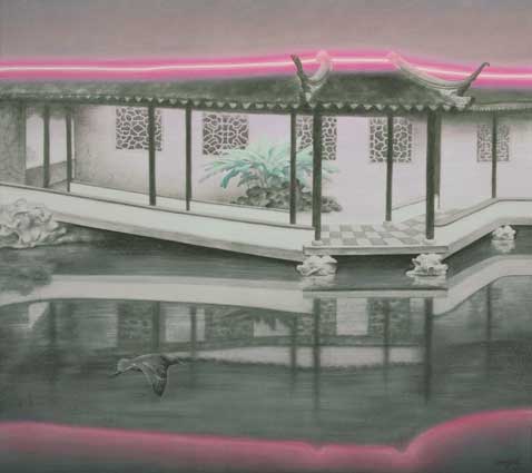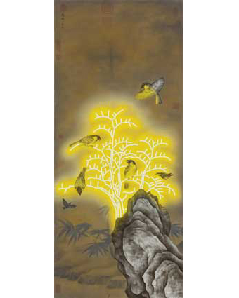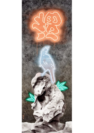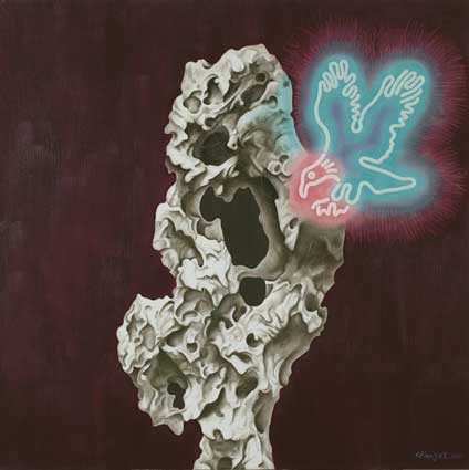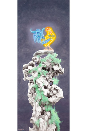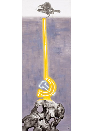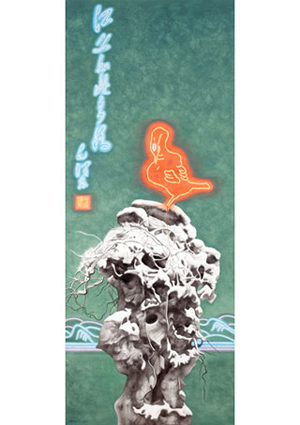 Certain parts of the paintings painted with the gaudy style popular in the nineties – bright colours, flat smearing, mixed with some extremely dazzling dyestuff, put together in the same frame with the Taihu Lake Stones tasting both tradition detailed brushwork style and freehand style. In terms of image and nature, he was trying to find a contrast and a harmony between gaudy and refined, bright and gloomy, humorous and boring. Although there were certain pop characteristics of the nineties and the gaudy painting language, actually he did not follow the pop language line in this series. Neon lights and Taihu Lake Stones did not belong to the direct symbol style neither. The frame of painting was seeking a kind of artistic conception similar to that of the traditional Chinese paintings: stressing the readability and the taste. And the process of creating the painting cared more about mood representation and the trial of new painting styles.
