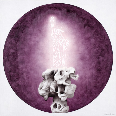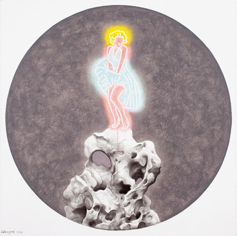 王長明對太湖石的懷念,雖然仍隱隱作痛,但現代生活也像霓虹燈的閃耀一樣,時不時敲擊著他“快樂”的神經,這種矛盾和糾結,使王長明在切割太湖石的同時,畫了近來《霓虹燈下的太湖石》的系列作品。王長明畫面中的太湖石依舊保持著原來的“兼工帶寫”方法,然後用霓虹燈編織出各種文化時期和類別的形象,如毛主席像,毛主席詩詞,佛像,夢露像,羅馬柱,朱耷的鳥…,然後這些不同時期和類別的形象,通過現代生活這個閃亮、豔俗、時尚、膚淺、快樂的霓虹燈形式,就被統統轉換成一種“盛世”景觀,並與王長明內心那個完全對立的雅文化—太湖石並置在一起。這種盛世生態是當下我們無法回避和需要思考的。