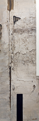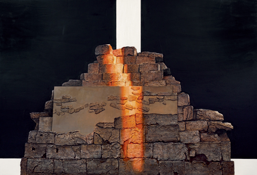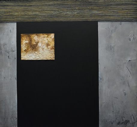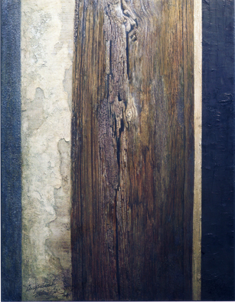 應天齊長年版畫創作中對於材質的思考和嫻熟的駕馭材質的本領,在新作中得到很大的發揮,在創作手法上應天齊同樣運用了實物拼貼、木版紋理、色料手繪的綜合媒材表現法,營造出一種獨特的二維平面與三維空間共生的視覺效果。